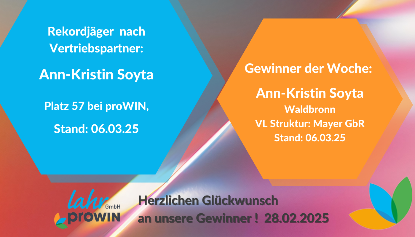In der gleichen Woche hat Ann-Kristin auch den Wettbewerb Rekordjäger nach Vertriebspartner gewonnen. Unter allen Vertriebspartner bei proWIN war Sie auf Platz 57.